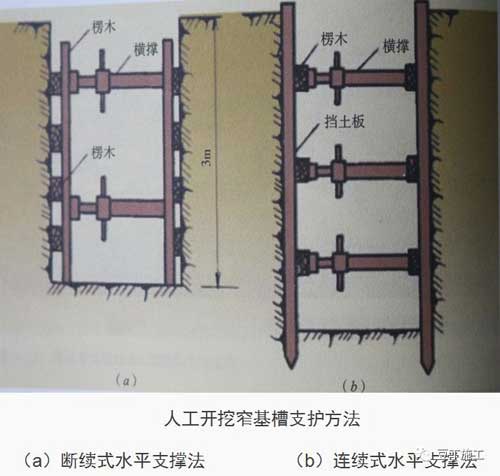 (1)断续式水平支撑法由楞木和工具式横撑组成。楞木间断放置,横撑上下撑牢。用于宽度不大,深度3m以内,且土质含水率低的黏土沟槽开挖的土壁支撑