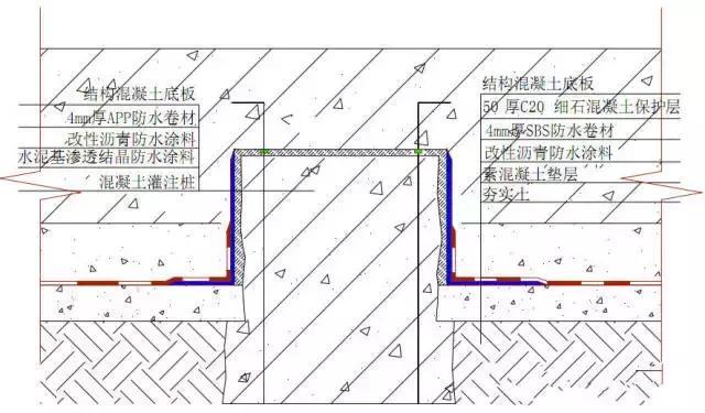 采用水泥基渗透结晶型防水涂料 +改性沥青防水涂料 +卷材的复合防水做法。: